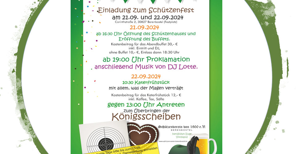 Am 21.+22.09.2024 feierten die Berenbosteler Schützen wieder ihr Schützenfest im festlich geschmückten Schützenhaus in der Corinthstraße. Viele fleißige Hände halfen bei den Vorbereitungen und trugen zum Gelingen bei.